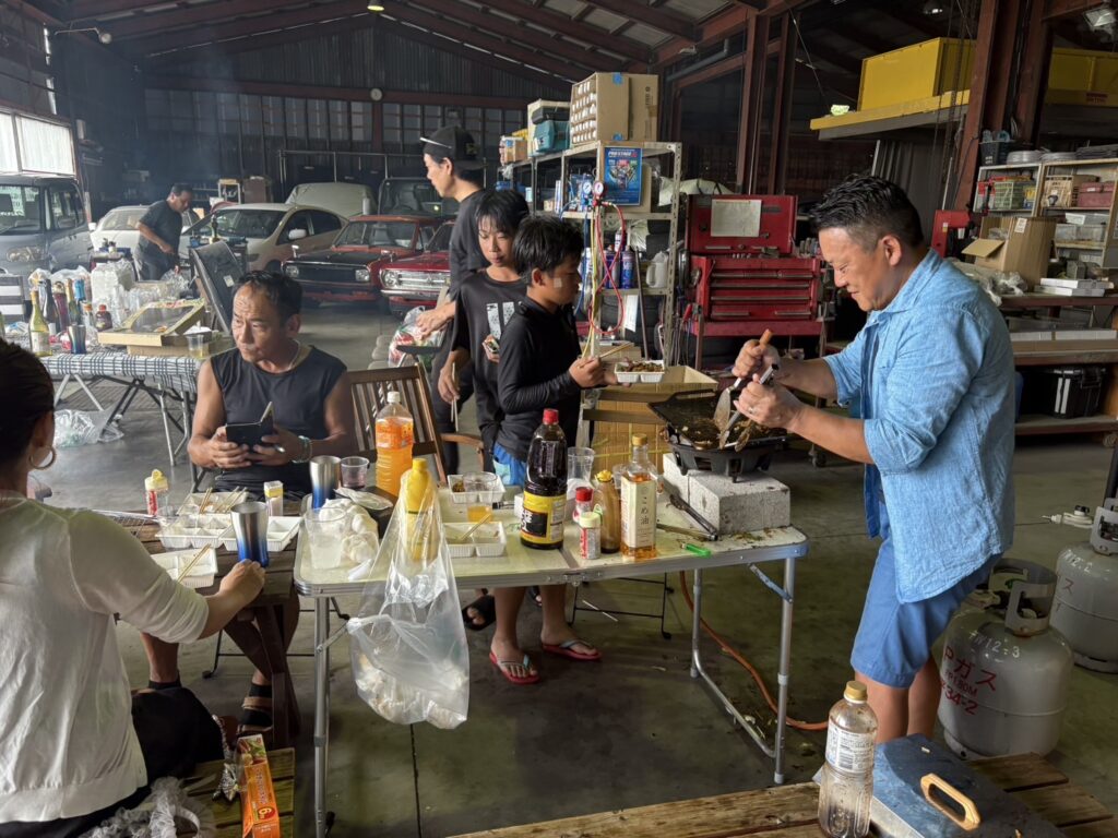 鶴和会員が経営するガレージツルワでは例年お盆シーズンにバーベキュー大会を行っていたので快く場所も提供いただきました。